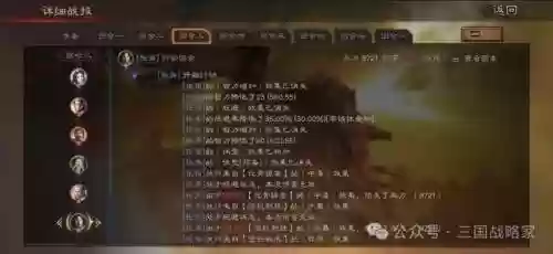 在详细战报中点击张角名字,一般下面带着小横线,可以道当前状态张角的四维属性值,545智力,张角身上有乡勇、规避、规避、援护等,真的好方便。